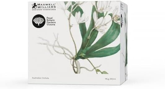 Brighten your home with this mug from the Australian Orchids collection. Designed in collaboration with the Royal Botanic Gardens Victoria, it features a hand-coloured lithograph from the Australian Orchids volumes by early Australian botanist Robert D Fitzgerald. This charming mug captures the unique beauty and vivid colours of native florals, with an elegant tapered shape and a generous 350ml capacity. Made from quality porcelain and beautifully gift boxed, it’s a wonderful gift idea for any occasion.